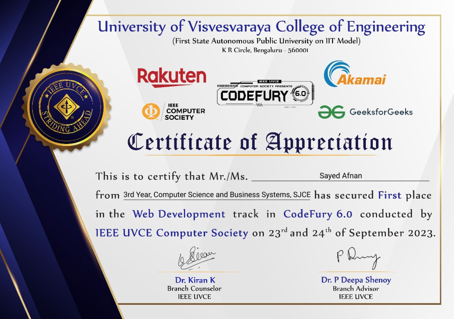 My team, 'White Hat Seniors,' consisting of Shaiz Ahmed Shariff, Hisham Akmal, Furqan Ahmed Shariff, and myself, emerged as the first-place winners of the national-level hackathon, Infothon, conducted by The Department of Information Science and Engineering, Vidyavardhaka College of Engineering in the web development domain.