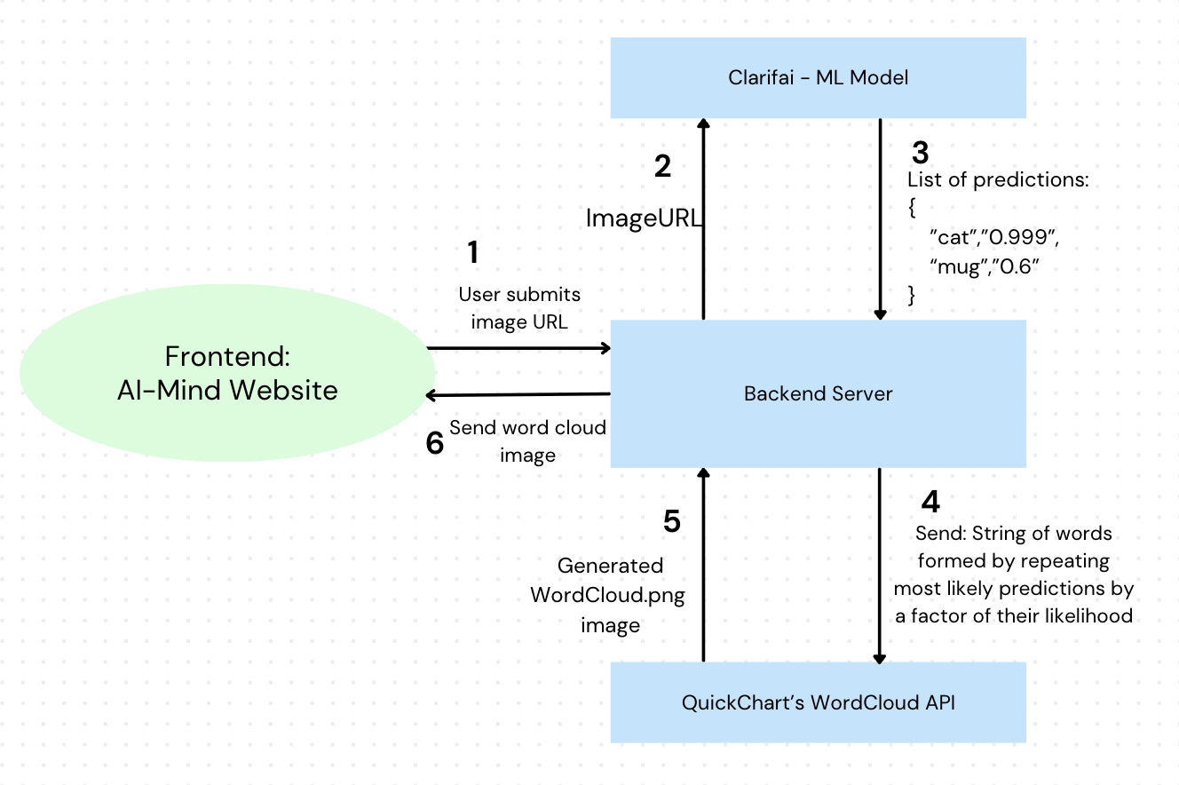 The machine learning model used is Facebook(Meta)'s Image Recognition DEIT base model (that was trained on 1 million images and can classify 1000 classes), which is hosted on Clarifai's API and the wordcloud is generated using QuickChart's wordcloud API.