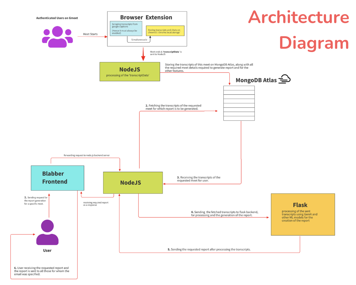 The Blabber chrome extension listens to the meeting by scraping captions generated by Google Meet using Transcriptonic and sends the transcript to the NodeJS backend server when the meeting ends.