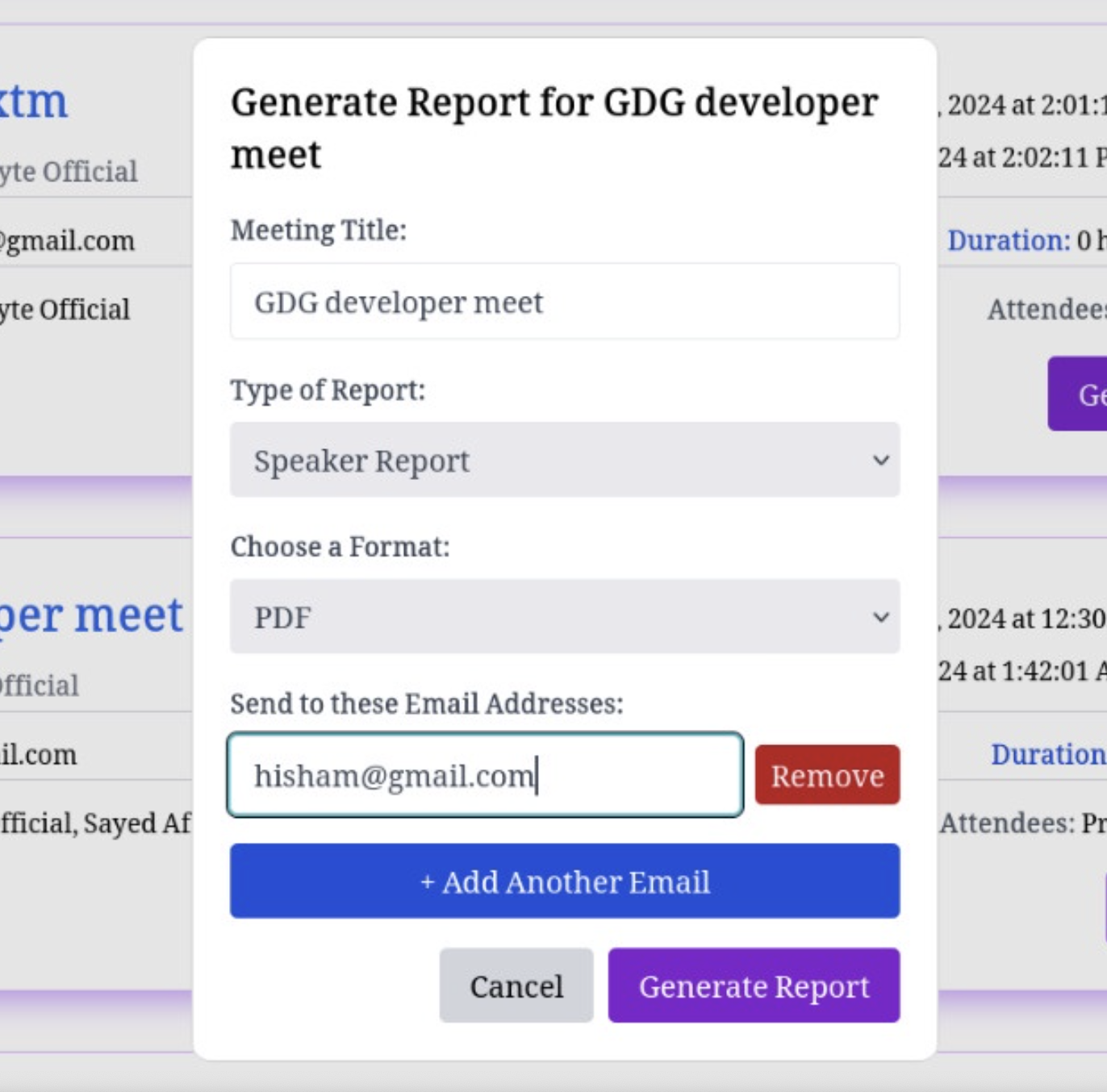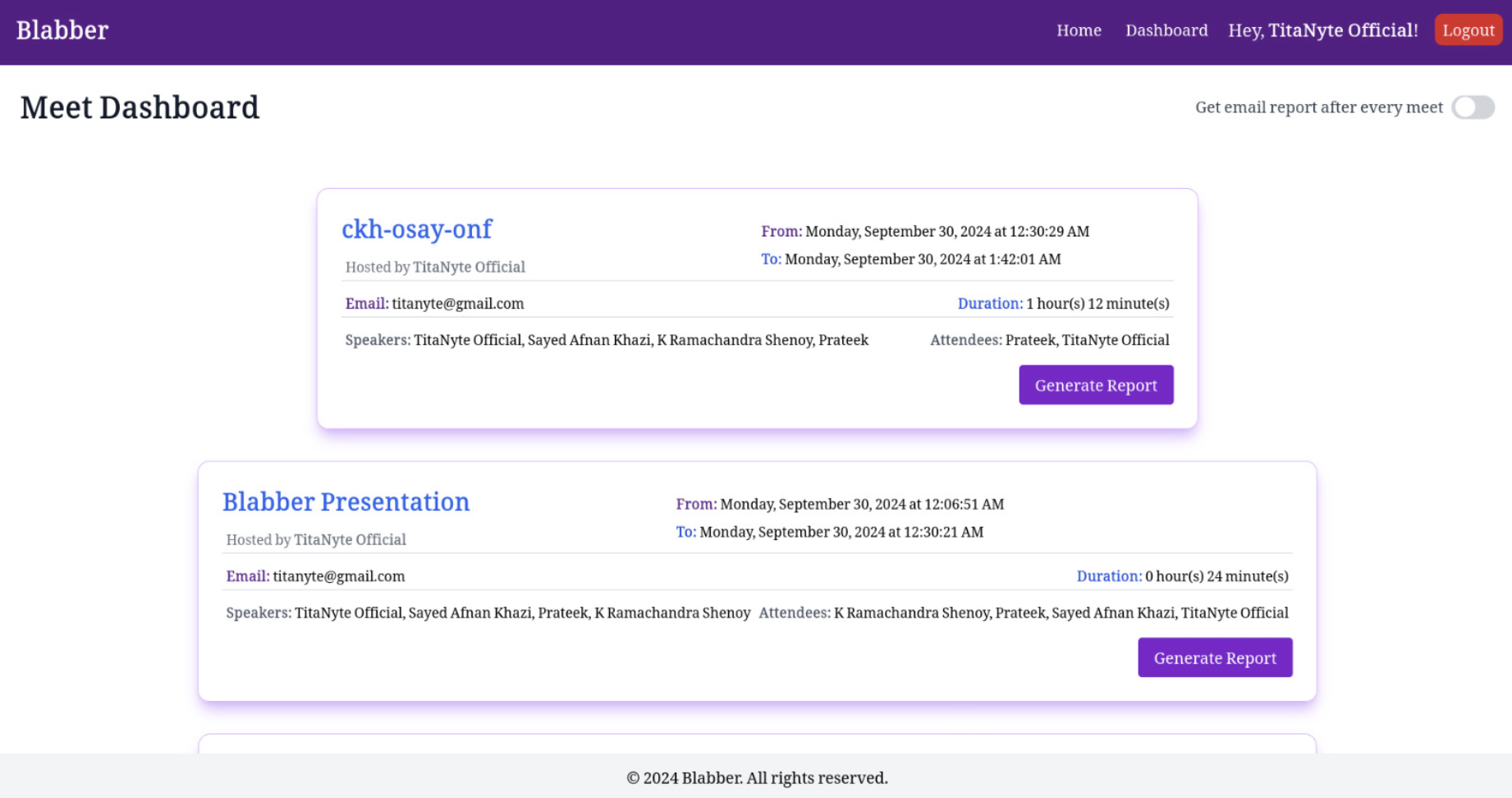 After the meeting is over, users can view previous meetings and their details on the Blabber platform and can generate and share reports.
